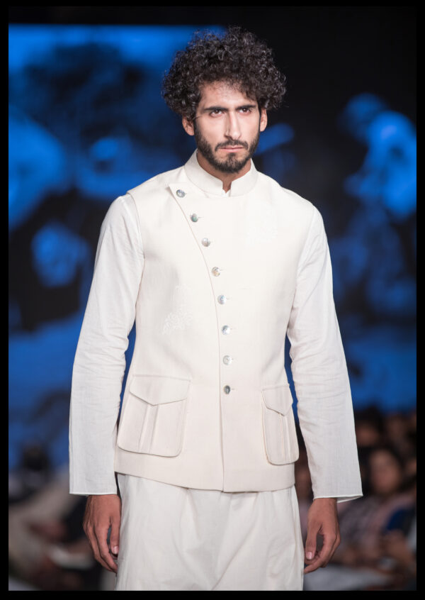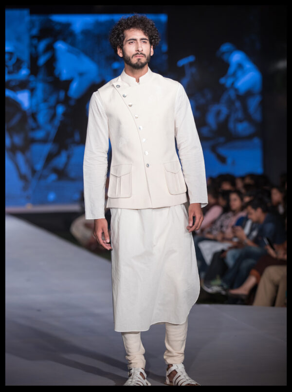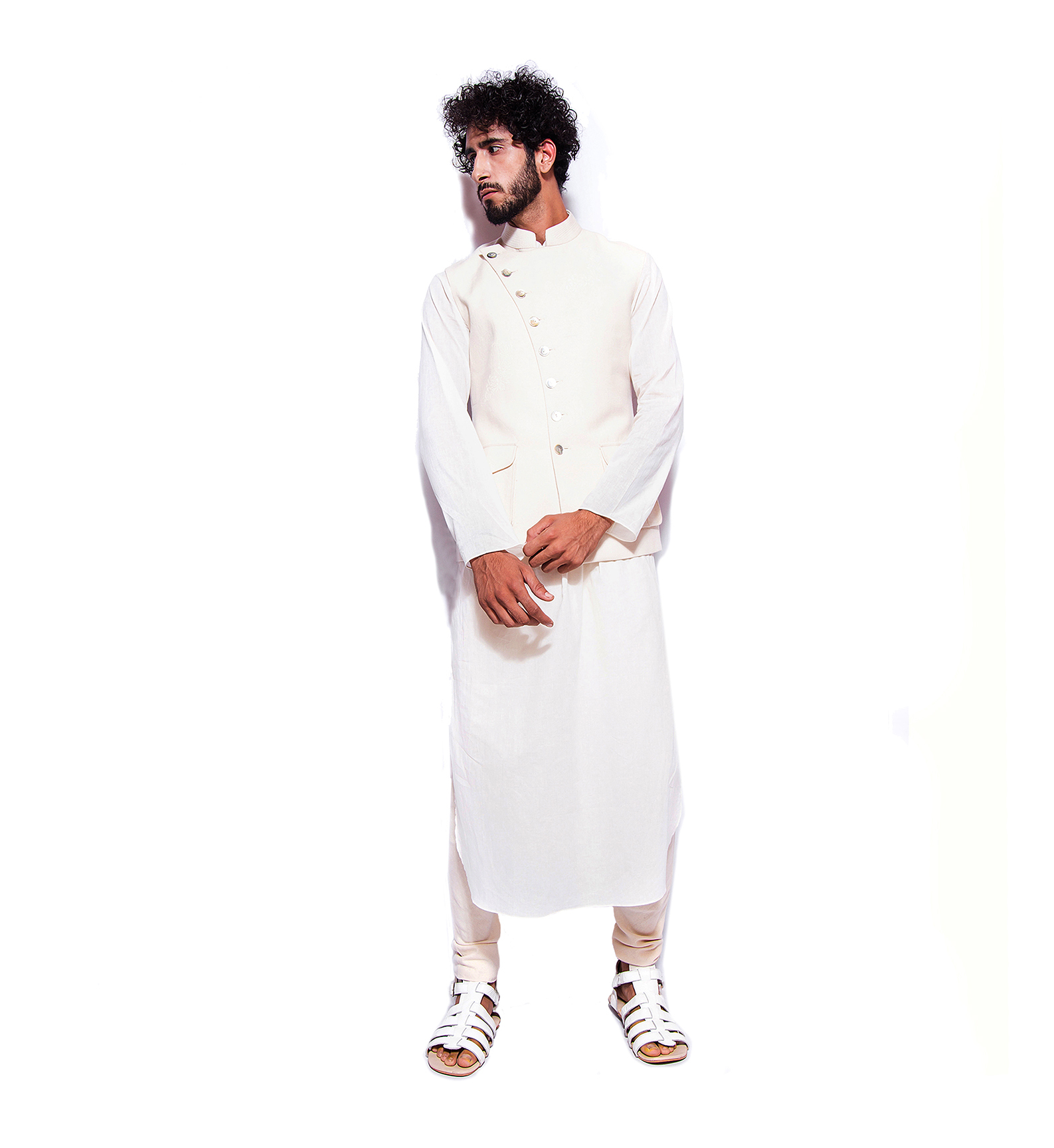 Exquisitely Tailored Mens Cotton Kurta Churidar along with Box-Pleated Waistcoat in Khadi with Tonal Print, for a neat and contemporary look at any traditional congregation.