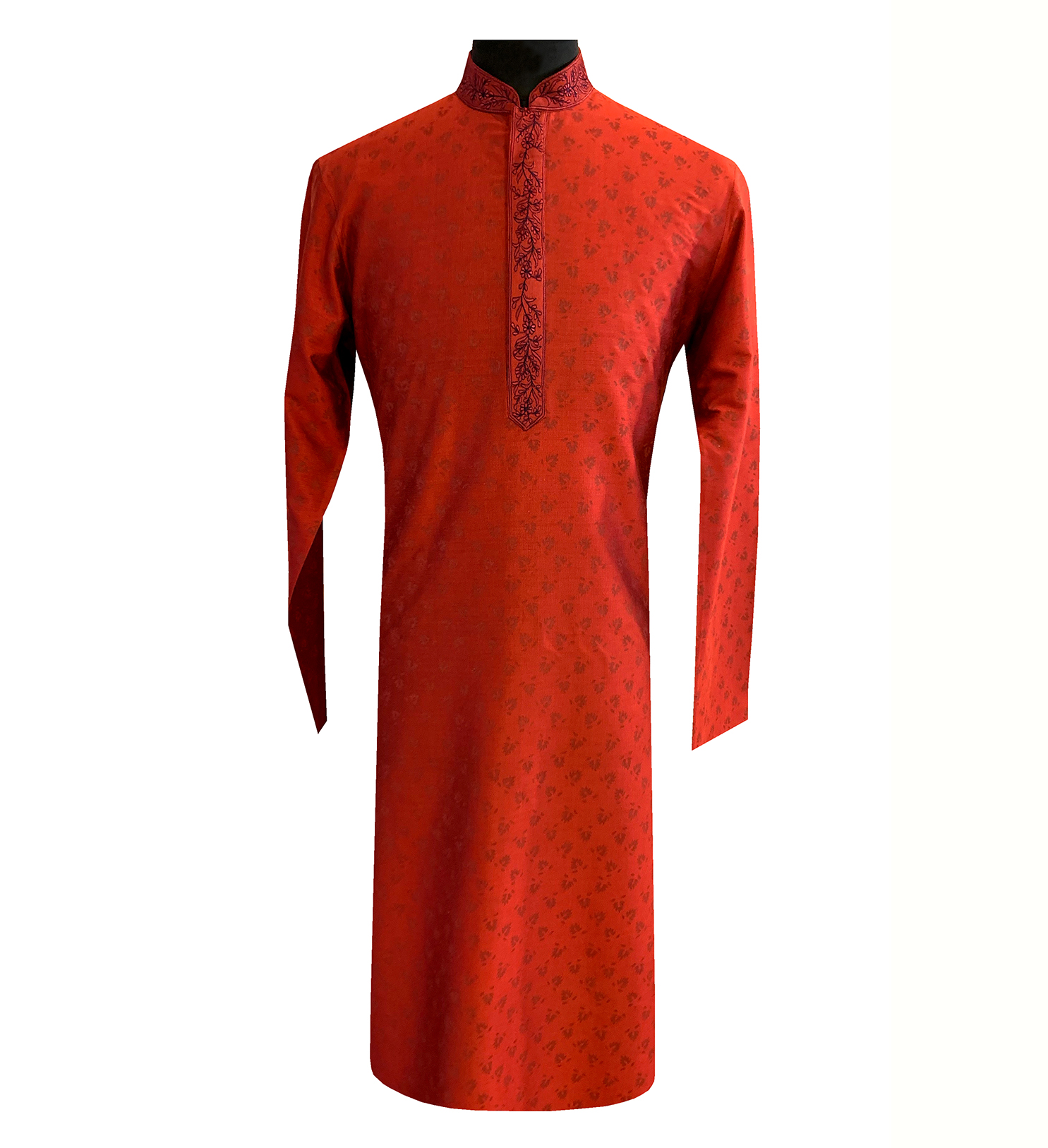 Exquisitely Tailored Mens silk Kurta Churidar with Contrast Emb. and tonal print, for a neat and contemporary look at any formal congregation.