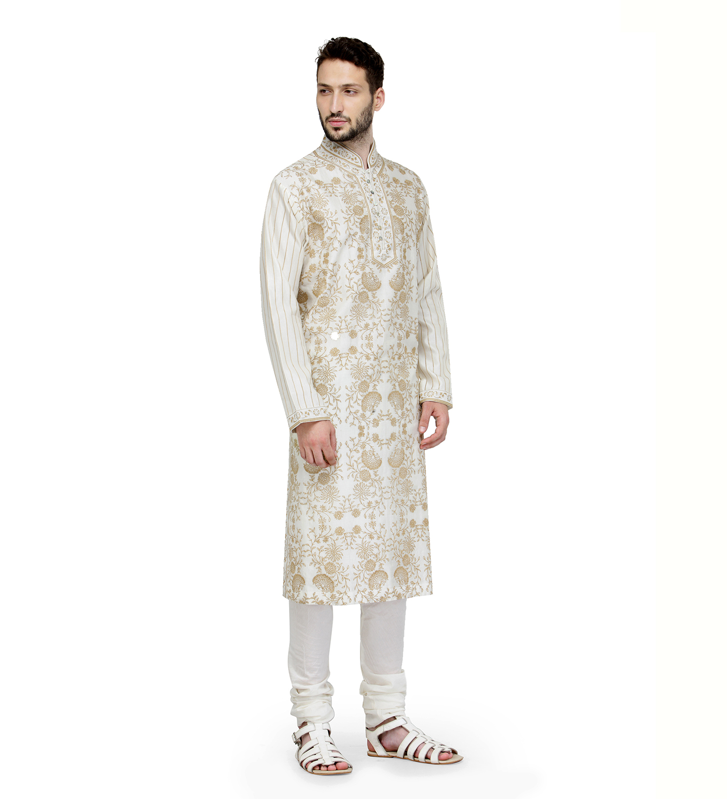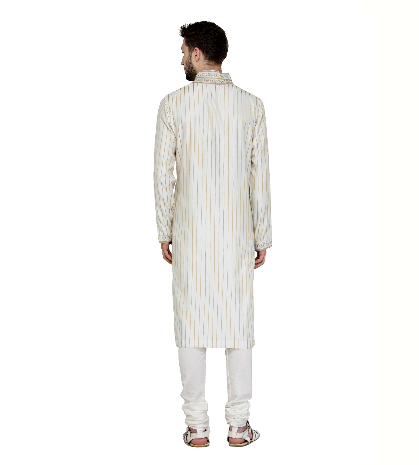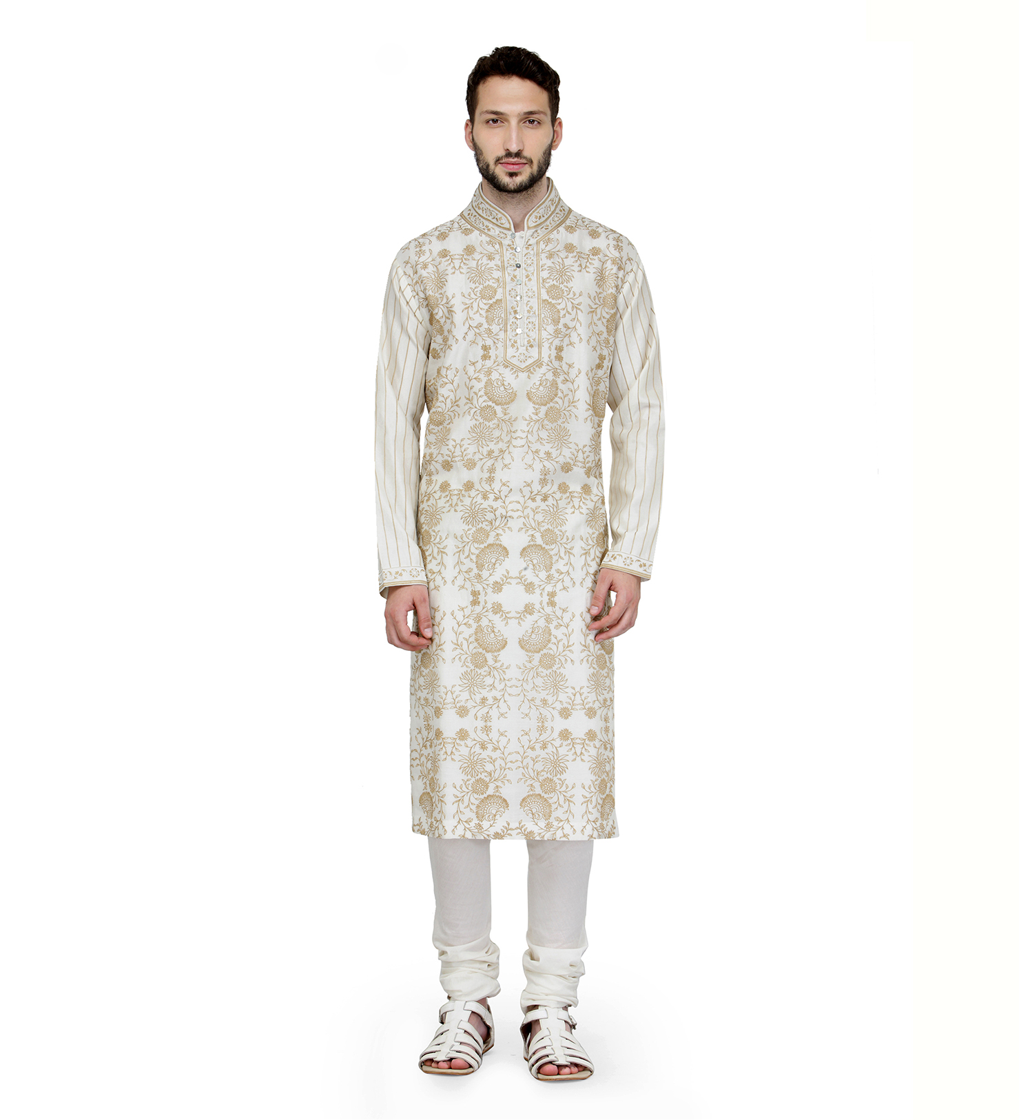 Exquisitely Tailored Mens fine chanderi Kurta Churidar with Intricate Contrast Emb., for a neat and contemporary look at any formal congregation.