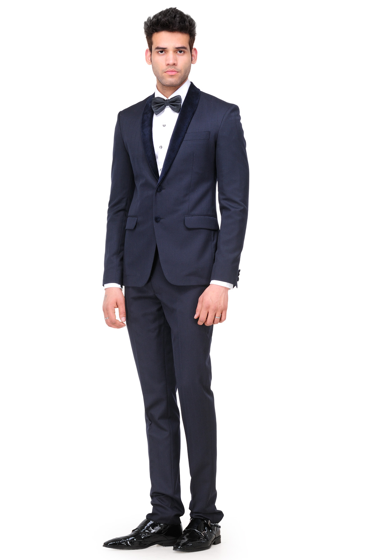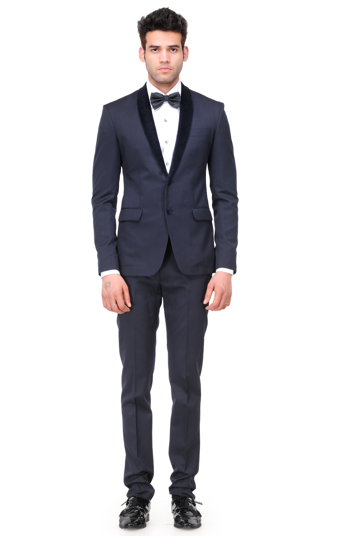 Exquisitely Tailored Mens Suit with Silk Velvet Detailing, for a neat and contemporary look.